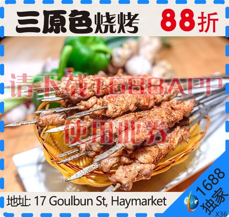 【三原色烧烤】 烧烤 “烧烤”可能是人类最原始的烹调方式了, 所以也被写在现代人的基因图谱里。 这种流传千古的令人口水三千丈的独特食物 当然也要被华夏吃货们带到了全球 古往今来,没有人能抵抗得了烧烤的魅力! 在烧烤面前,任何“减肥宣言”都是纸老虎! 最近, 小编就在悉尼街头发现了一家超超超棒的烧烤店! 地理坐标:17 Goulbun St, Haymarket 营业时间:5pm-12am 三原色 进到店内,超ing的装修风格霎时间就吸引了眼球! 三原色 把夜晚还给烧烤 约上两三好友 开几瓶啤酒 享受惬意的撸串人生! 在烧烤架上翻腾的牛板筋 贝壳上冒着腾腾热气的扇贝 鲜嫩多汁微微带辣的烤茄子 组成了安慰白天一切喧嚣的烧烤夜晚! 菜品推荐 红柳烤羊肉 三原色的红柳烤羊肉串除了块头大 还有浓郁的香气 焦脆的羊肉外皮 饱满新鲜的肉质 经验老道的师傅把肥肉烤的又香又酥 瘦肉劲道弹牙 肥瘦相宜 肉嫩汁多 麻辣小龙虾 夜宵好伴侣,必点小龙虾! 作为夜宵界的霸主 麻辣小龙虾这几个字, 光是开口说一遍就要流口水了! 三原色的麻辣小龙虾更是小龙虾中的一绝! 经过师傅秘制的调料精心成菜后, 口味辣鲜香,色泽红亮, 质地滑嫩,滋味香辣! 让你在剥虾的时候口水就忍不住往外淌! 大盘鸡 皮焦肉烂的鲜美鸡块夹杂着青椒、 红椒鲜亮的色彩, 混合在汤汁中的土豆淀粉吸收了油腻, 用筷子夹起宽且薄的面片在汤汁中搅拌几下, 立刻被稠密的汤汁包围。 放到嘴里麻辣鲜香, 诸般滋味齐齐涌上舌尖。 绝妙无比! 福利来啦! 现在扫码下载我们的1688澳洲APP,使用我们的独家免费折扣通优惠券,就可以获得8.8折优惠哦~还在等什么!快拿着优惠券去撸串啊! 欢迎扫描图片二维码 下载我们1688澳洲APP, 更多商家折扣信息等你发现! 手拿优惠券, 吃遍全悉尼! 欢迎各商家进行商业合作问询, 详情请戳小仙女!